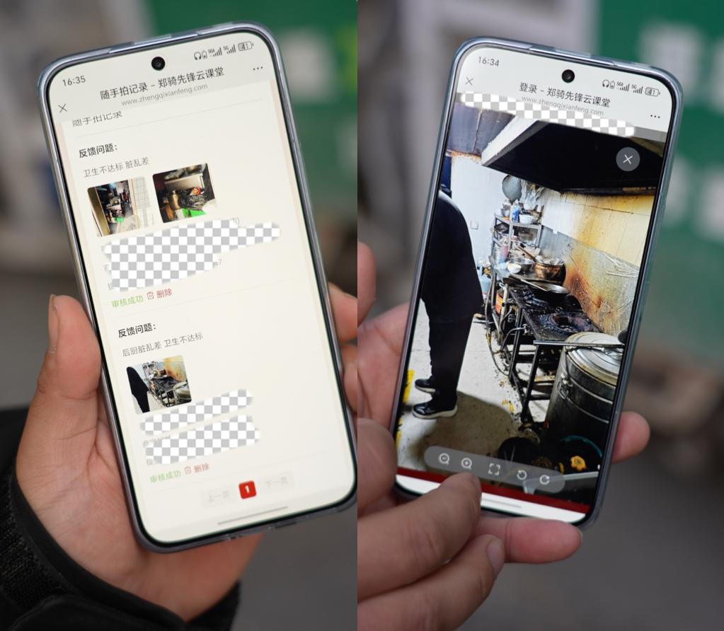 图为骑手展示的“郑骑先锋随手拍”手机操作页面(拼版照片)。新华社记者 孙清清 摄
